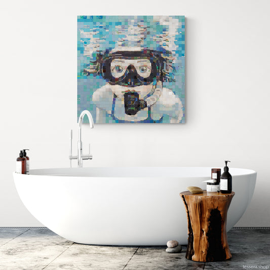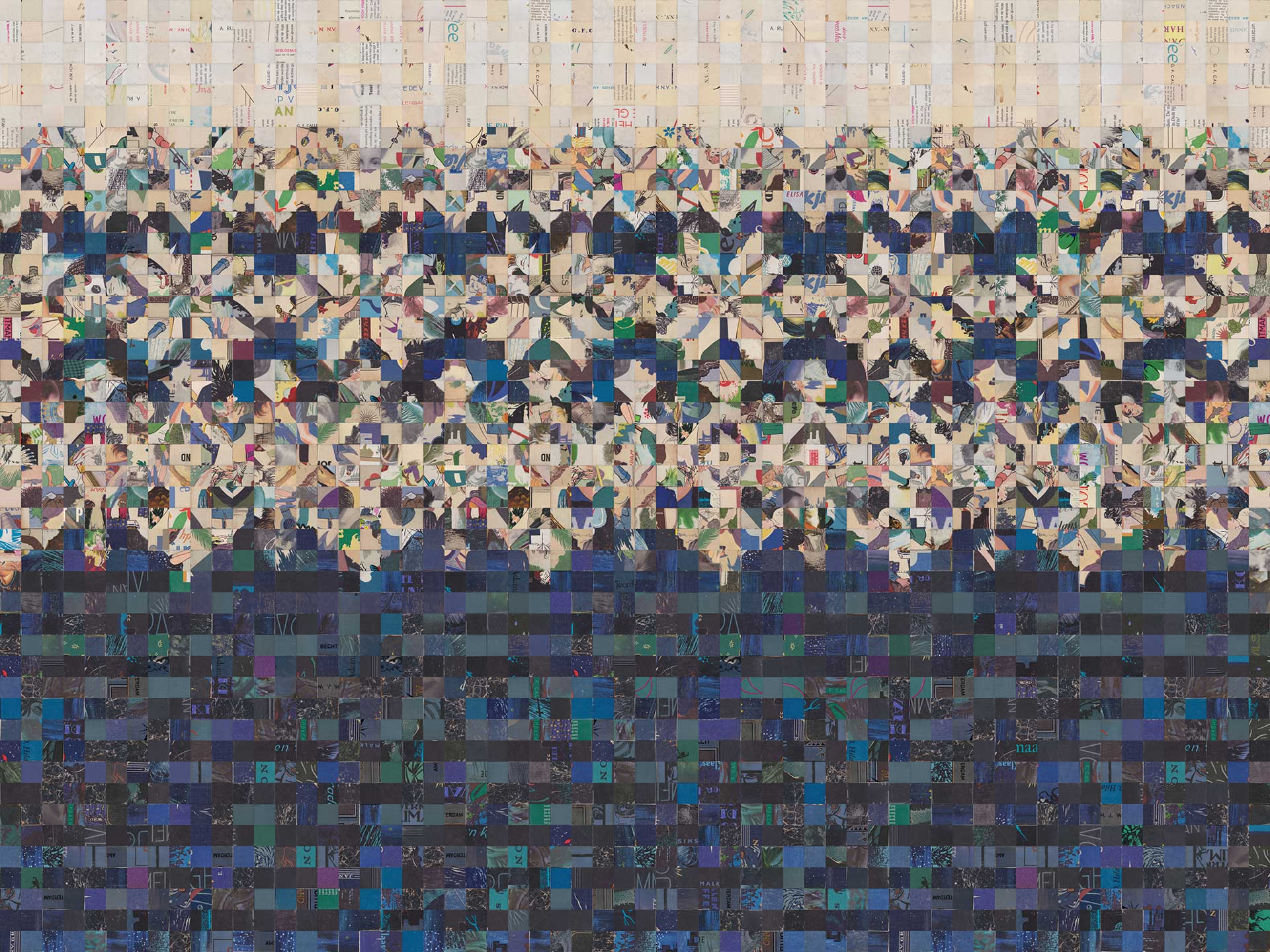 Each Tessera print is crafted using small digitized tiles originally cut out of a range of materials such as children's book covers. Each tiny, colorful tile acts as a blob of paint, layered and arranged with the same care and intention as brushstrokes on canvas.